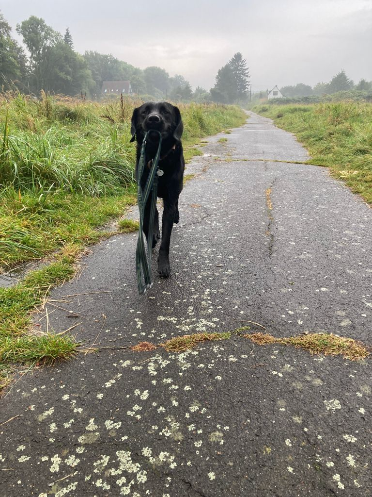 Damit Sinje beim Laufen die Hände frei hat, trägt Bruno wichtige Sachen in einem Korb im Maul.