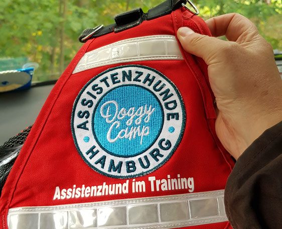 Ganz einfach: Sie tragen während Ihrer Arbeit eine Kenndecke auf dem Rücken und da steht meist auch ihre Funktion drauf. Unsere Kenndecke ist rot und es steht noch drauf: Assistenzhund in Ausbildung.